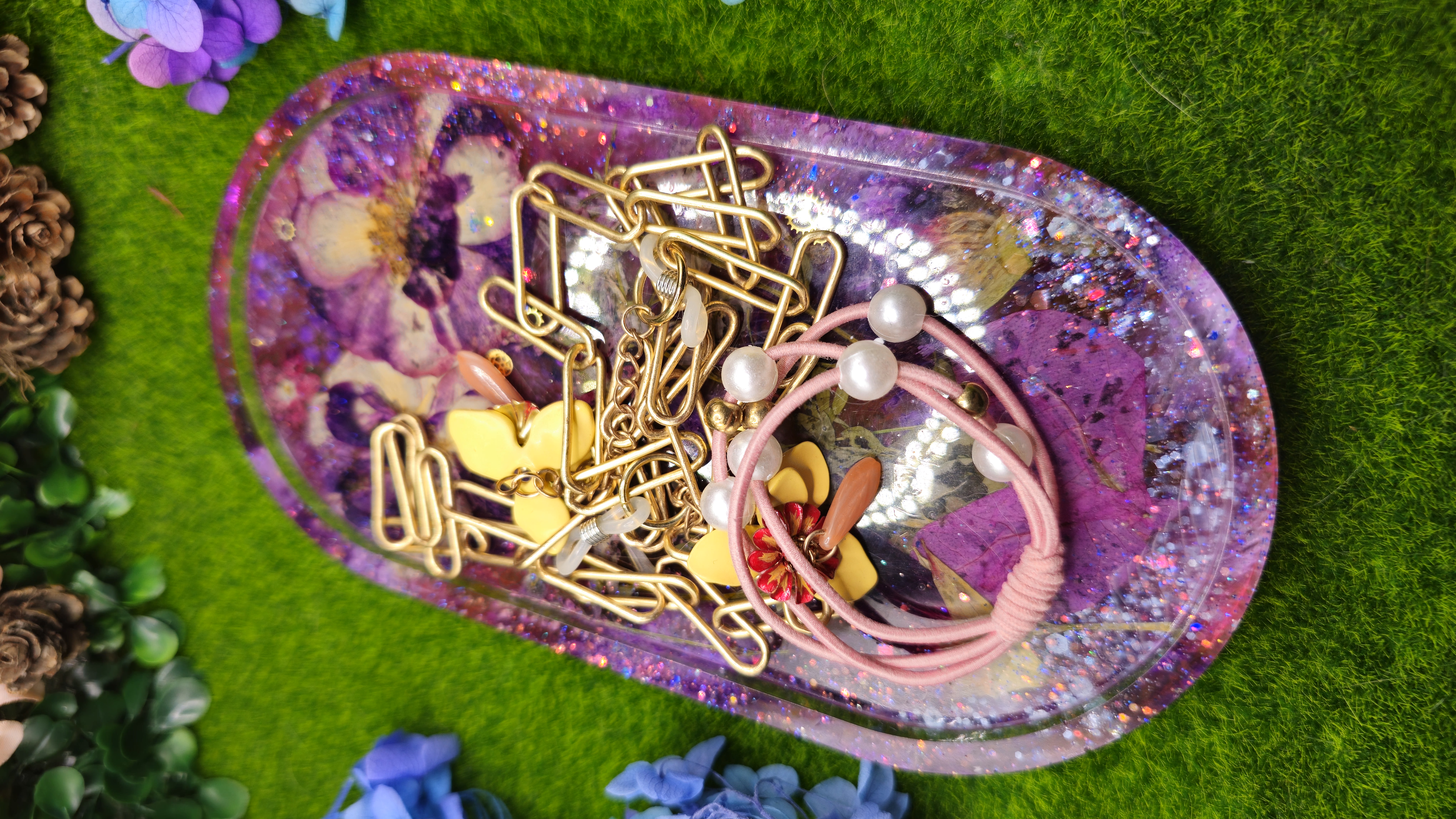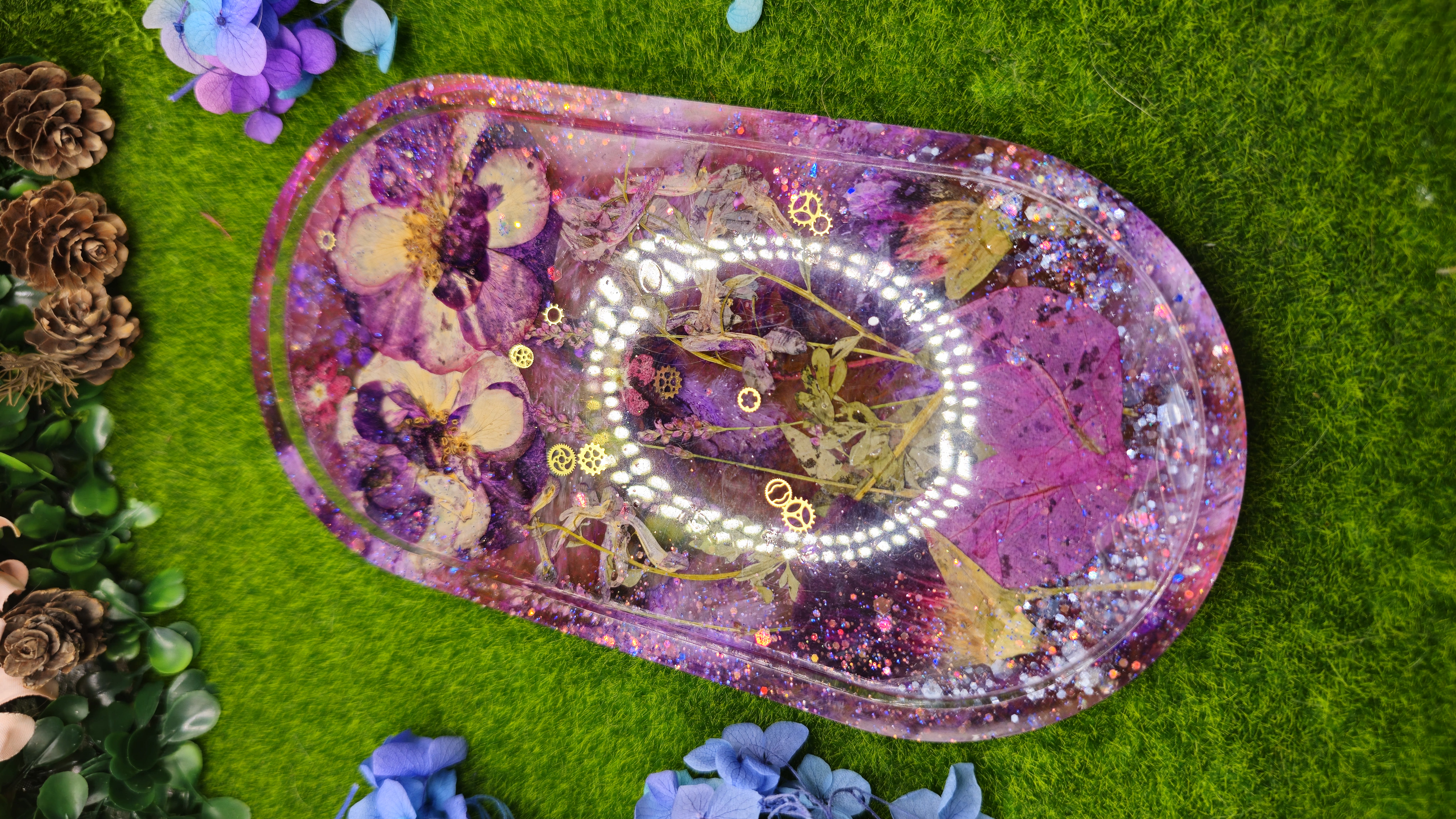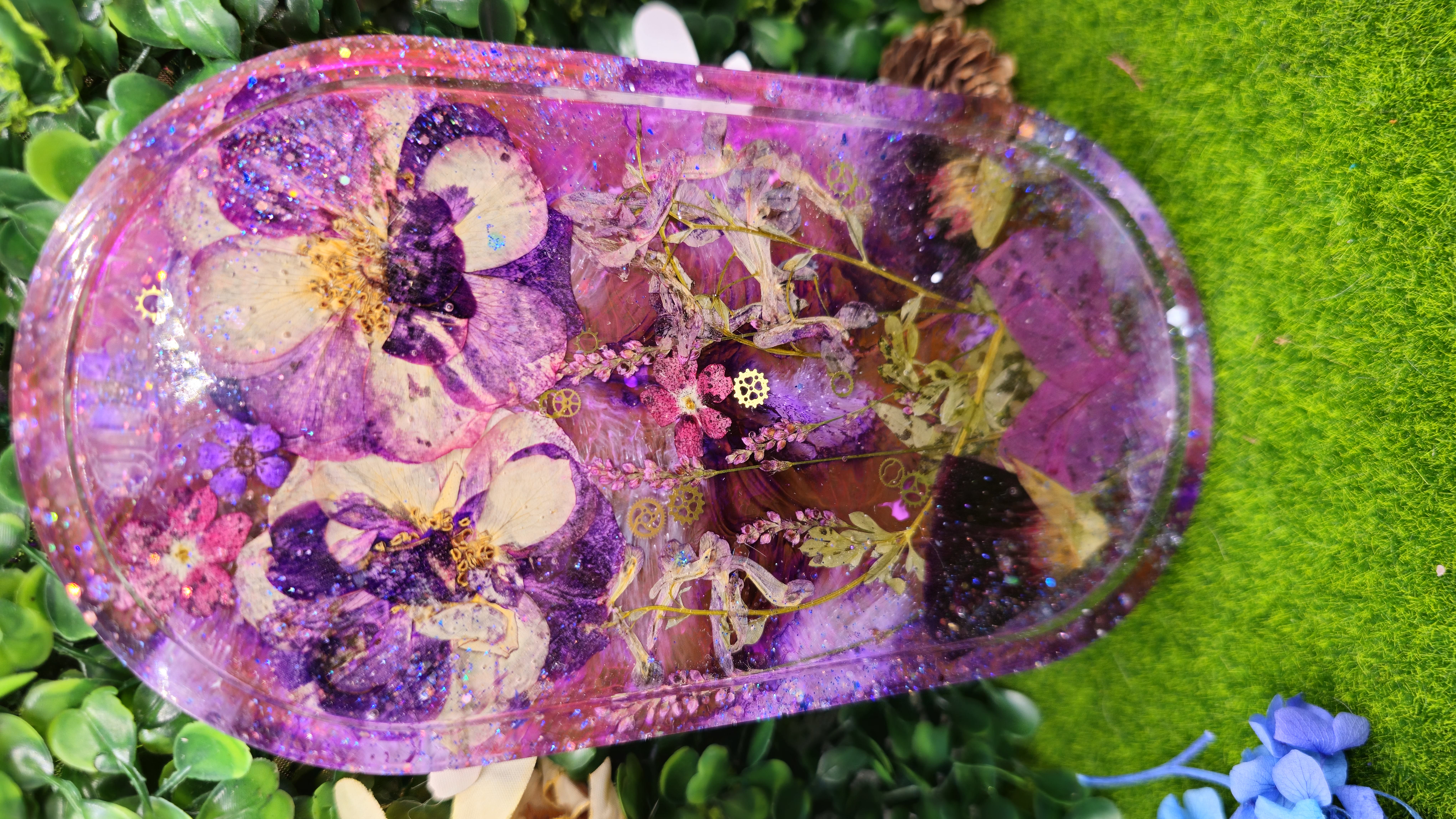 Descubre una bandeja decorativa con un hermoso diseño floral lleno de color. Bandejas únicas, irrepetibles y hechas a mano, con flores 100% naturales, prensadas y seleccionadas meticulosamente. Úsala para tus joyas, llaves o velas! Estas bandejas en resina son increíblemente resistentes, a prueba de golpes y rallones y soportan hasta 180º de temperatura. Resina certificada como no tóxica y apta para alimentos. Puedes pedirla personalizada!